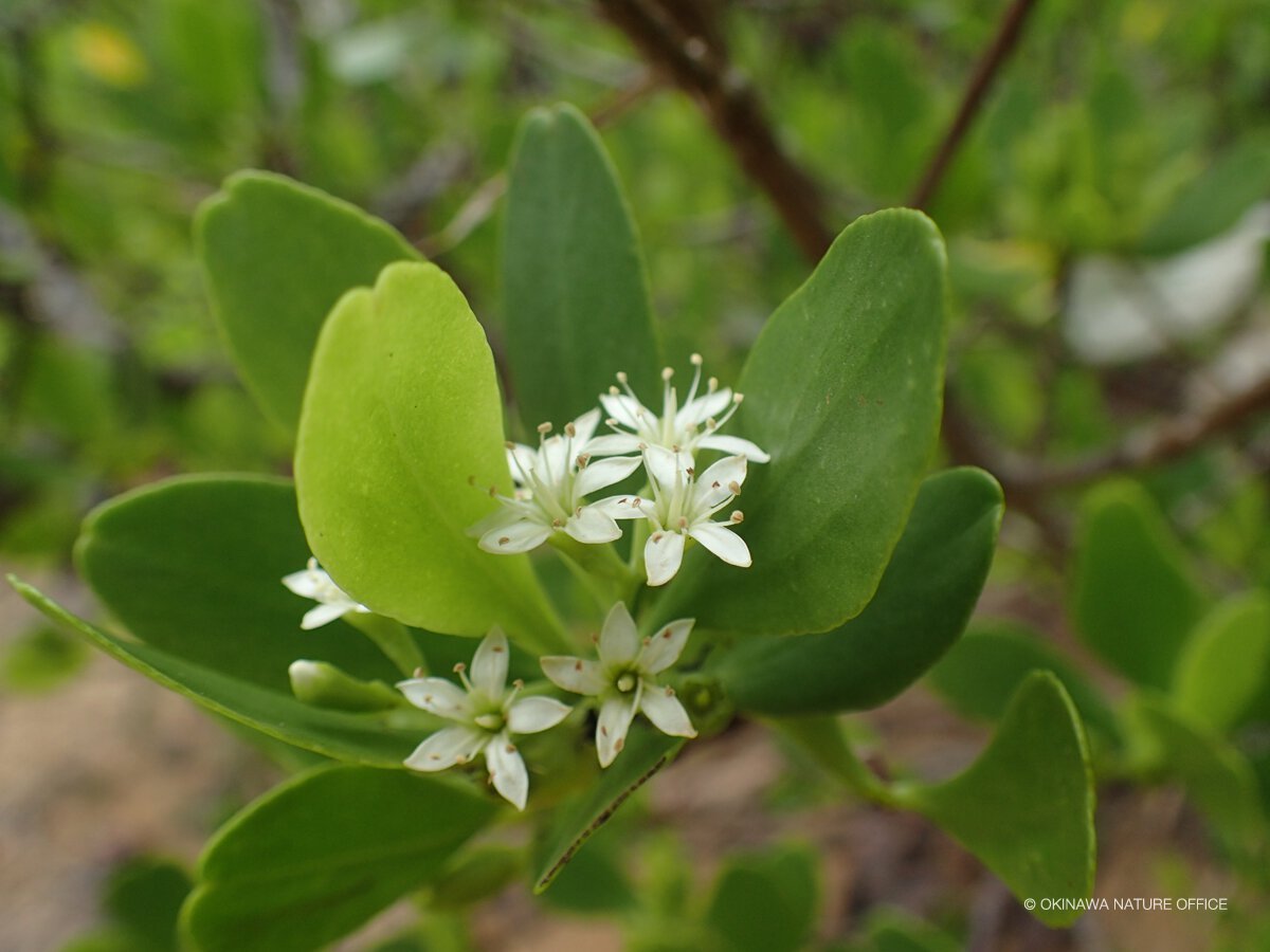 金武町の億首川では4種類のマングローブが見られます。その中に沖縄本島では最北限に自生する絶滅危惧IA類(CR)の「ヒルギモドキ」も見られます。